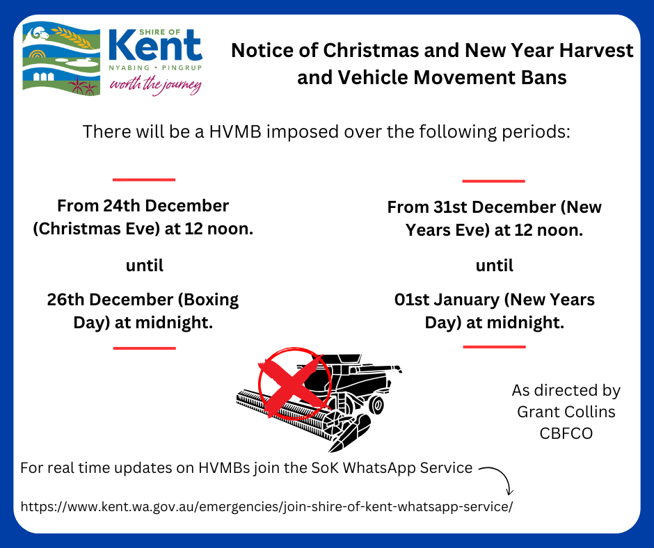 Notice of Christmas and New Years Harvest and Vehicle Movement Bans Posted on 20 December 202420 December 2024Posted in News To join the WhatsApp service, click here See the flyer below for more information.